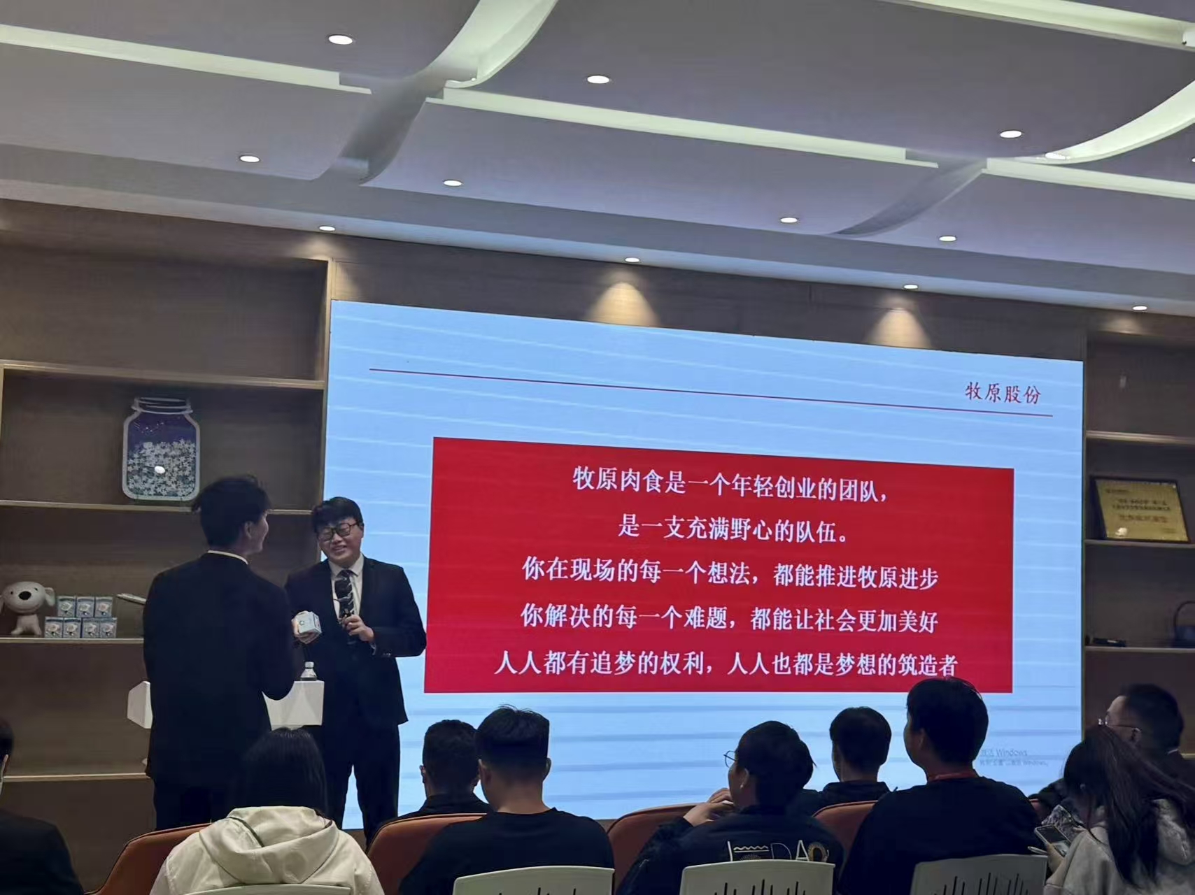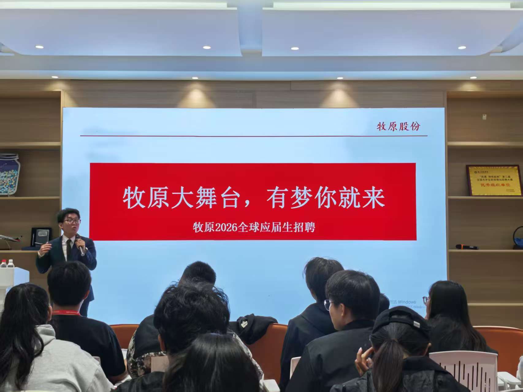 牧原食品宣讲会气氛热烈。招聘负责人路傲老师介绍,公司1992年于南阳成立、2014年上市,深耕形成生猪养殖为核心的全产业链,已是全球领先生猪养殖企业。同时阐述“让人们吃上放心猪肉”的愿景与责任担当,详解人才培养体系与晋升通道,并通过实例展示智能养殖、循环农业等核心优势。