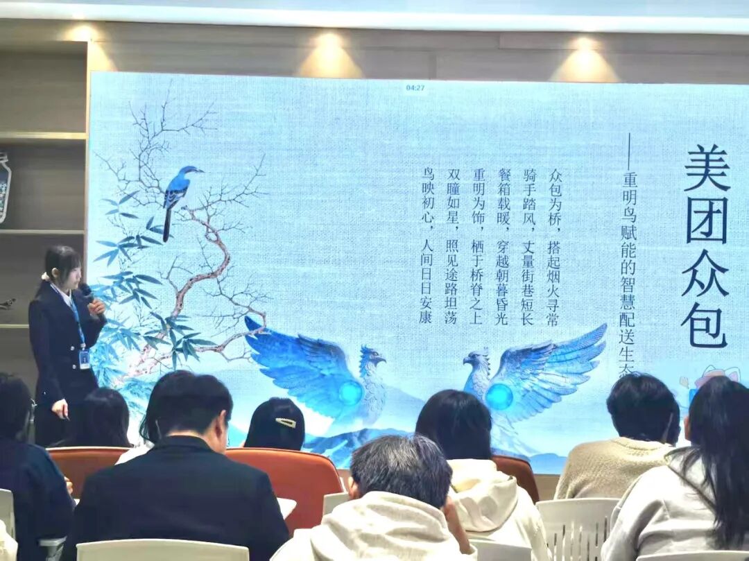 胡舒羽以重明鸟为喻,从众包之翼、科技之瞳、共生之境、未来之羽等方面,解析美团众包智慧配送生态、科技派单及公益价值,展现科技向善的温度。