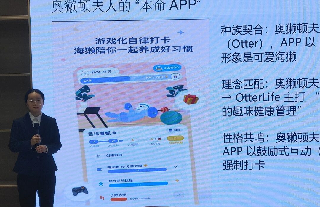 窦梦茹介绍了OtterLife健康管理 APP,其命名与理念关联奥獭顿夫人,核心亮点是游戏化健康管理,用户可养成海獭宠物,通过完成健康任务获取奖励。