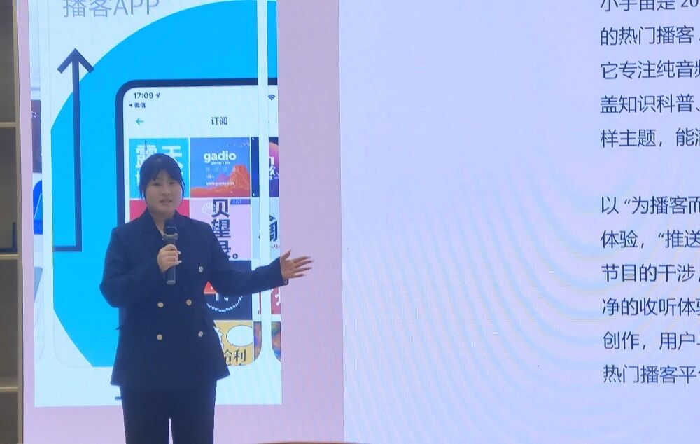 张雅欣介绍了 2019 年即刻团队推出的小宇宙播客 APP,它主题丰富、界面简洁、操作便捷,支持个性化推送与多设备使用,适配大学生和职场新人等群体,以 AI 为技术支撑。