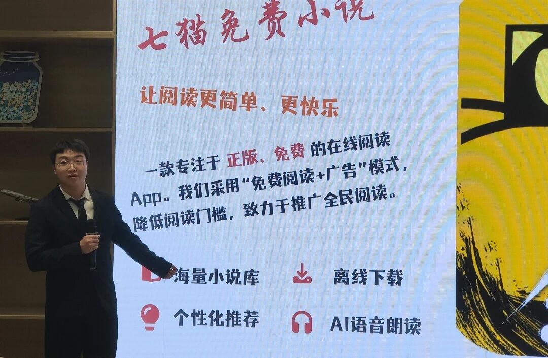 王祥瑞介绍了七猫免费小说 App,它以“免费阅读 + 广告”为核心模式,拥有海量正版书库,提供离线下载、个性化推荐、AI 语音朗读等功能,界面清爽且福利丰富。