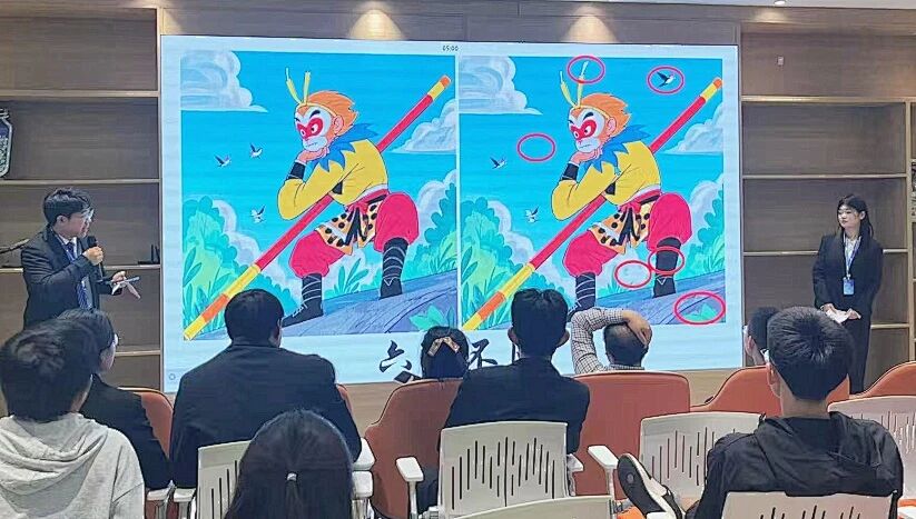 “火眼金睛辨真假”环节瞬间引爆全场!同学们化身“齐天大圣”,在西游记的奇幻画卷中开启“找茬”模式。有人一眼锁定破绽,有人抓耳挠腮直呼“妖怪哪里逃”!现场惊呼与欢笑交织,热烈的比拼不仅考验了眼力,更让团队的默契在火眼金睛下再度升级。