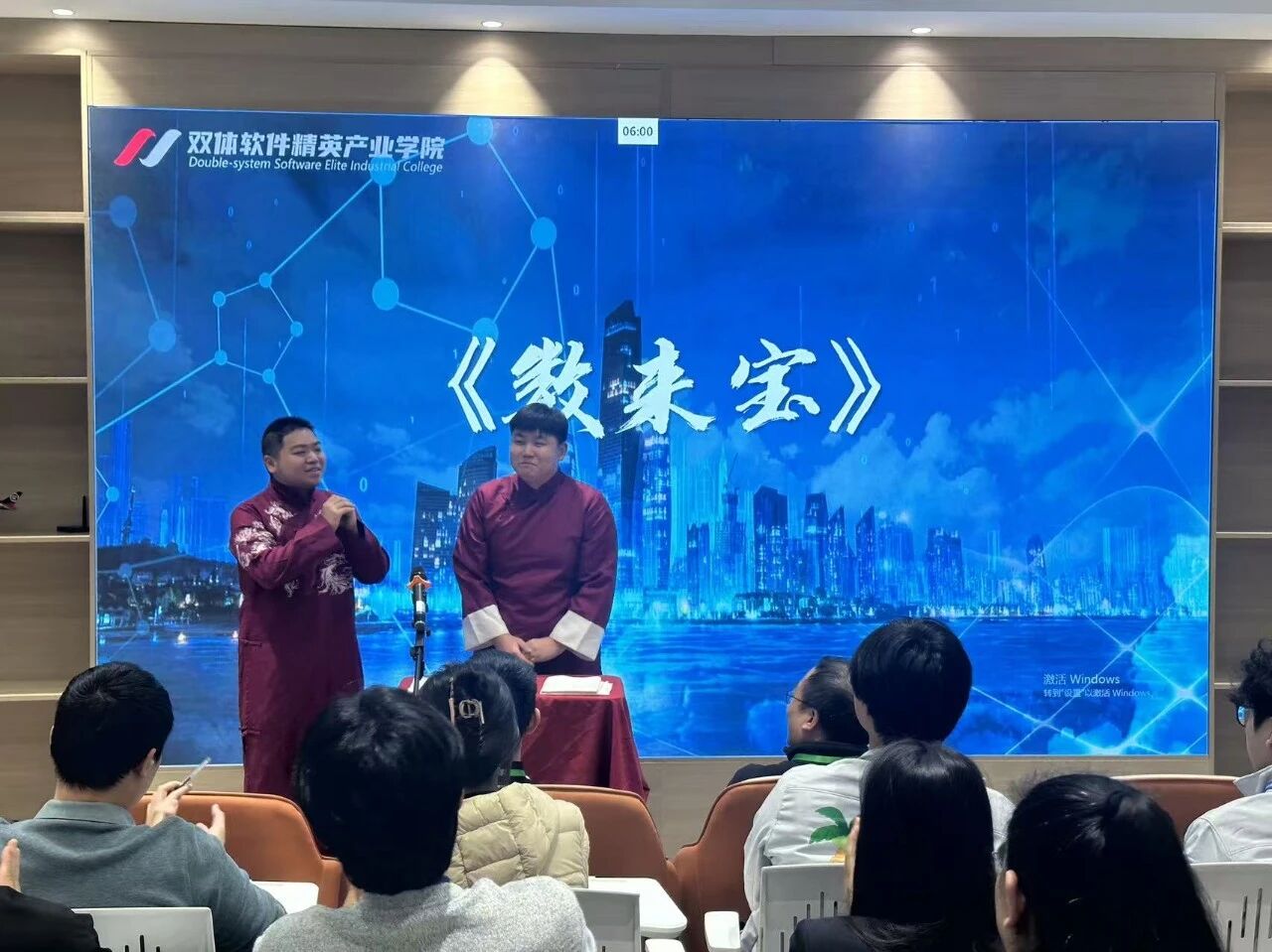 中场休息的间隙,启明三部的李怀杰和特邀嘉宾李梦阳登上舞台,一段诙谐幽默的双口相声瞬间点燃全场。逗哏的妙语如连珠般密集抛洒,捧哏的接梗化作精准的笑点锚点,让现场气氛瞬间热烈,笑声与喝彩声此起彼伏。