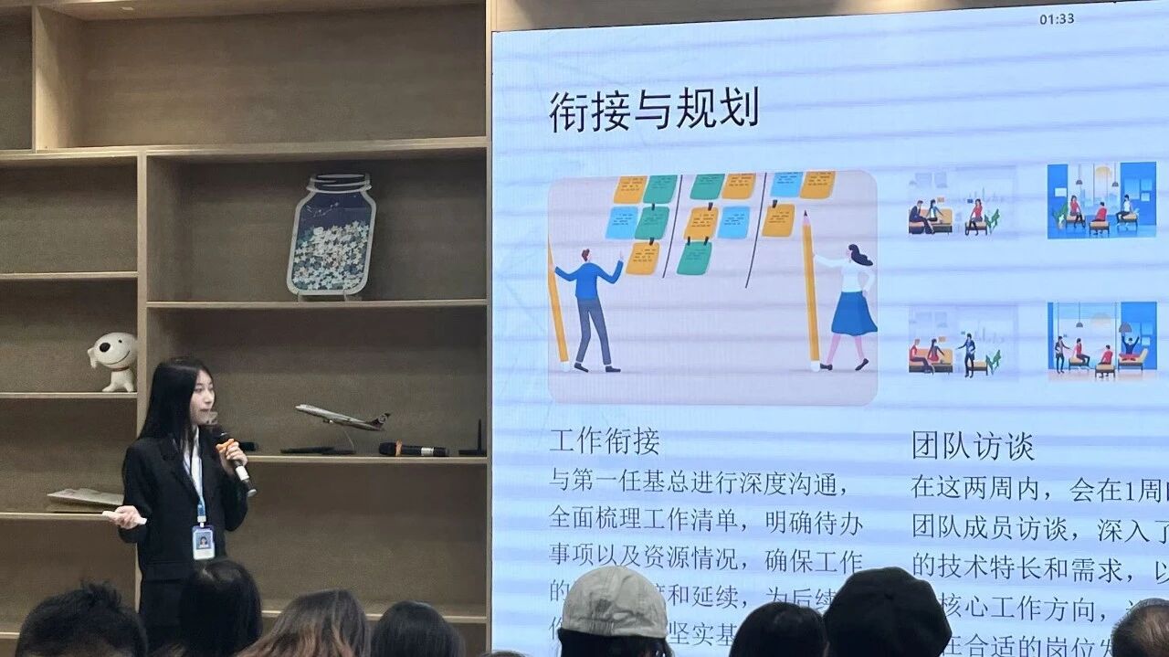 房瑞阳专业扎实,具备技术支撑力与团队统筹经验,适配基地总经理岗位;她明确任期核心职责,将做好工作承接、短期攻坚与团队激活;她计划做好工作衔接、团队访谈与计划制定,同时落实日常运营并启动技术交流周筹备。